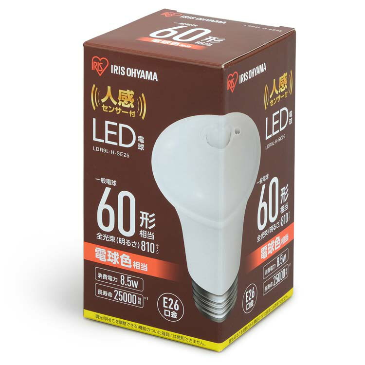 ●定格消費電力8.5W●待機電力0.2W●全光束810lm●ビームの開き120°●定格入力電流0.158A●設計寿命25000h●電源100V(50/60Hz共用)●使用場所屋内用●ランプ全体の明るさ一般電球60形相当●口金サイズE26●商品サイズ(cm)直径約6×高さ約10.6●質量約96g●カラーLDR9N-H-SE25:昼白色相当LDR9L-H-SE25:電球色相当(検索用:LED 電球 しょうめい あかり トイレ灯 でんきゅう 防犯 人感センサー 人感 じんかん センサー センサー付 電球色 昼白色 廊下 階段 トイレ 玄関 4967576432832 4967576432849)★