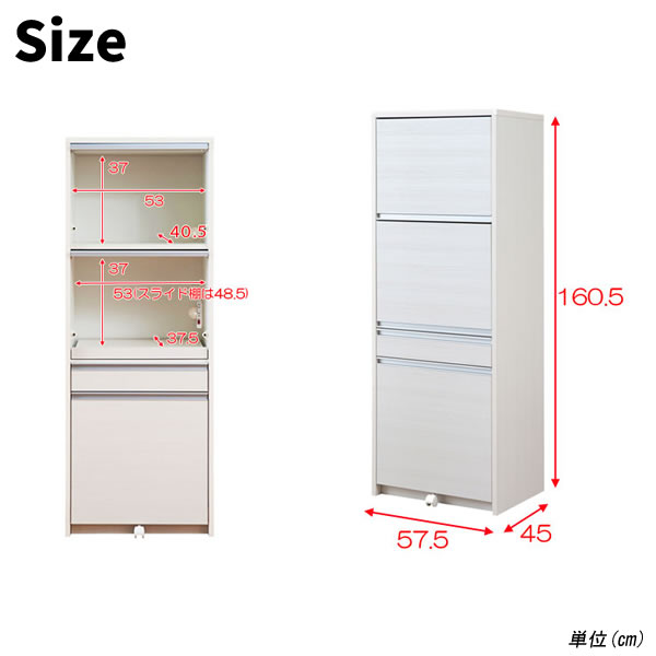 ■商品の仕様/前板:強化プリント紙化粧繊維板、スライド棚部:ポリエステル化粧繊維板、フラップ扉内部:プリント紙化粧繊維板(汚れ防止加工)、その他:プリント紙化粧繊維板 ■商品サイズ/本体:(約)幅57.5×奥行45×高さ160.5cm ■扉内有効内寸:上段(約)幅53(マグネット内々48.5)×奥行40.5×高さ37cm、中段(約)幅53(スライド棚部48.5)×奥行37.5×高さ37cm、引出し内寸:中段(約)幅47.5×奥行き33.5×深さ4.5(有効内寸7.5)cm、下段(約)幅42.5×奥行き34.5×深さ14(有効内寸47)cm ■付属品:ペール26.5リットル×2個 ■コンセント2口合計1500Wまで ■商品重量/(約)37kg ■商品耐荷重/天板:約20kg、スライド棚:約10kg ■日本製 ■完成品 お届け・納期について 通常、商品の在庫がある場合は1週間前後でお届け可能です。