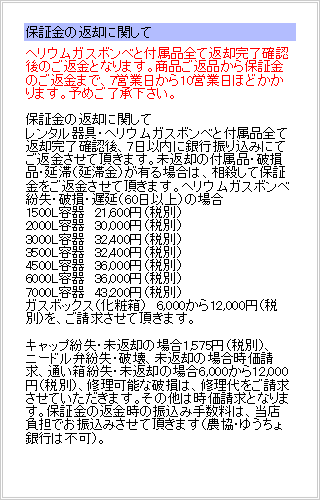保証金の返却に関してヘリウムガスボンベと付属品全て返却完了確認後のご返金となります。