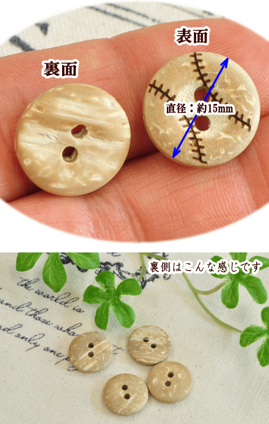 (例:1Mを5枚に分けて、1M・2Mを1枚ずつ、など)男の子の大好きな野球ボールナチュラルなココナツボタン天然にこだわった製法のため、同じものはひとつもありません。