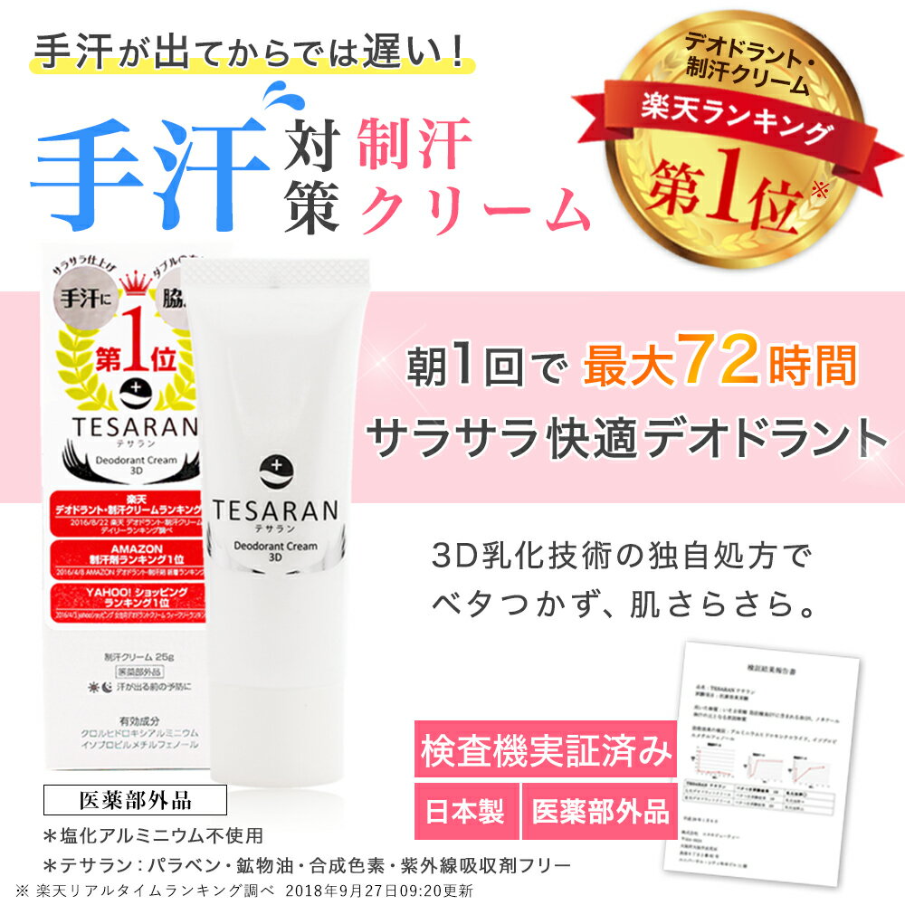 ギフト対応 商品名 TESARAN(テサラン)医薬部外品 内容量(1本) 25g 商品区分 日本製 医薬部外品 メーカー 株式会社Global Style Japan 広告文責 合同会社ONE 06-6423-8124 メーカー希望小売価格はメーカーサイトに基づいて掲載しています 関連キーワード: 手汗 脇汗 ワキガ クリーム すそわきが 顔汗 足汗 制汗クリーム デリケートゾーン 汗 止める 抑える 制汗剤 制汗 デオドラントクリーム デオドラント クリーム こども ギフト プレゼント 無添加 送料無料>